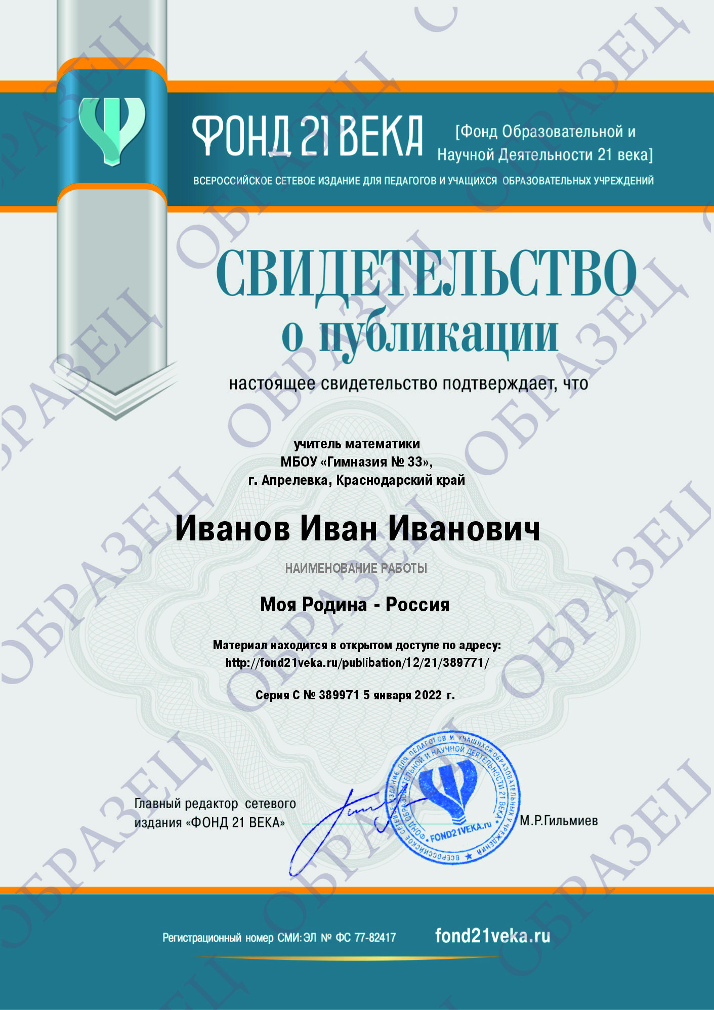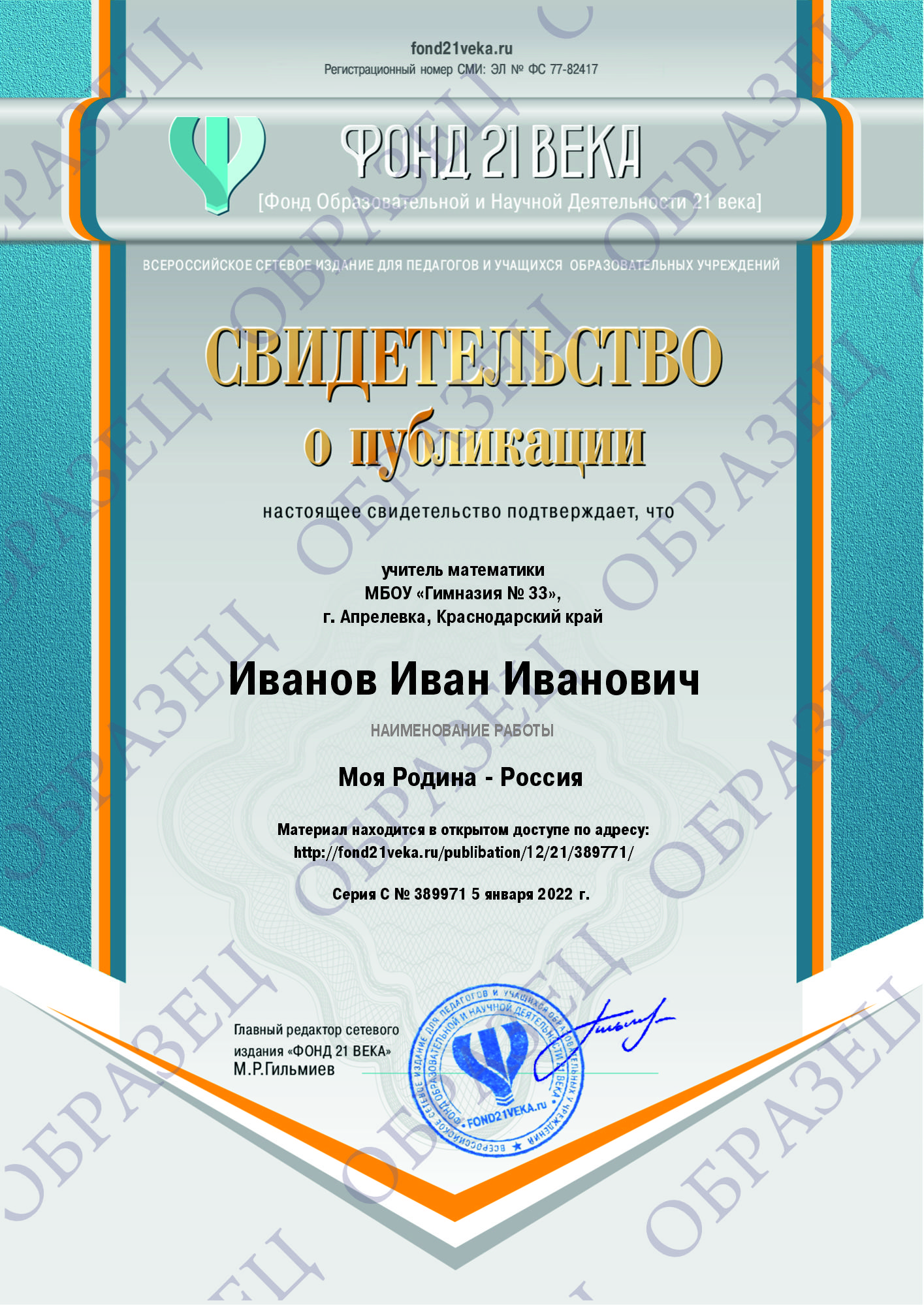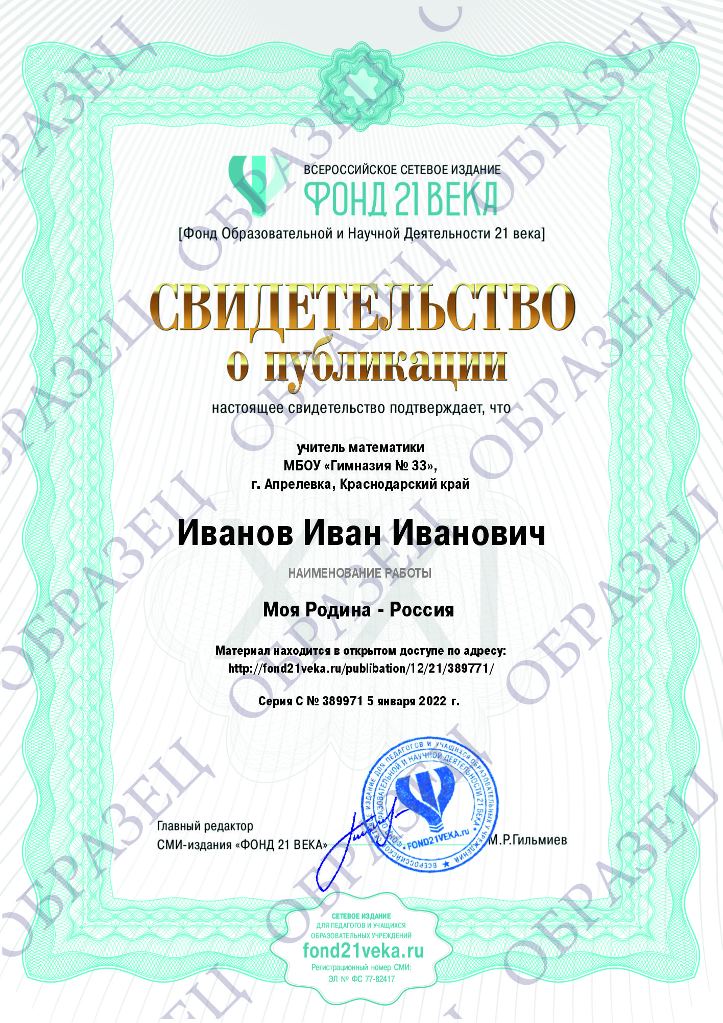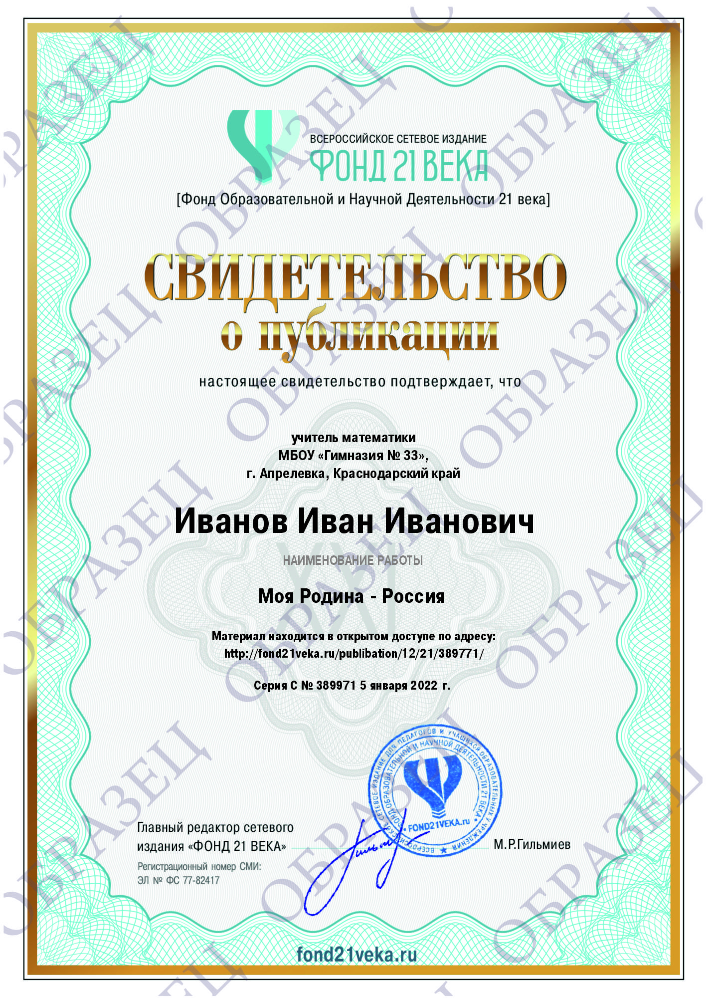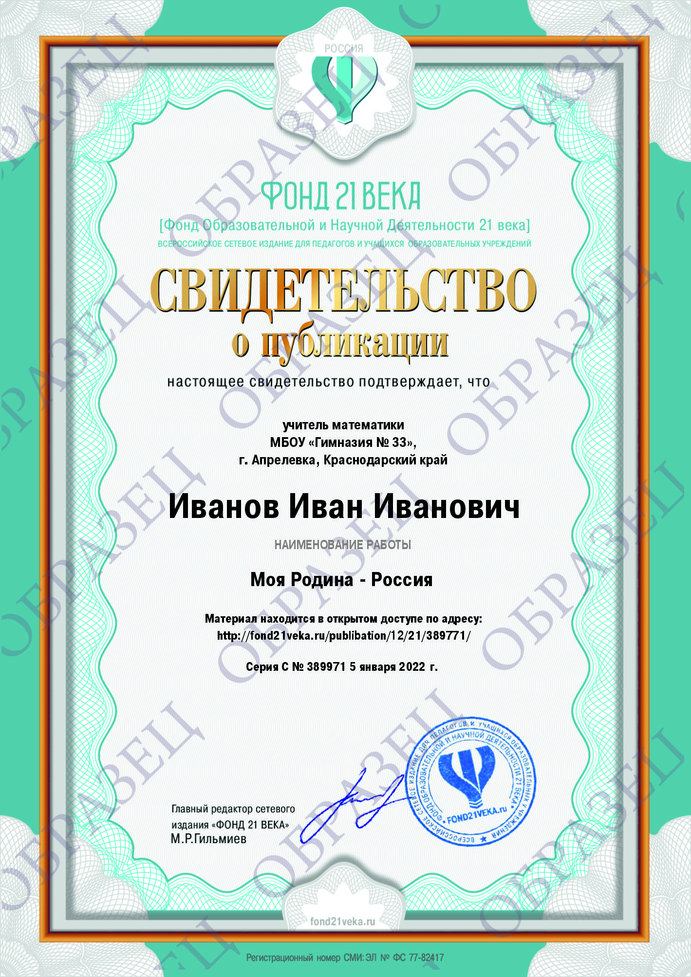ОБРАЗЦЫ СВИДЕТЕЛЬСТВ О/ПУБЛИКАЦИИ АВТОРСКИХ МАТЕРИАЛОВ