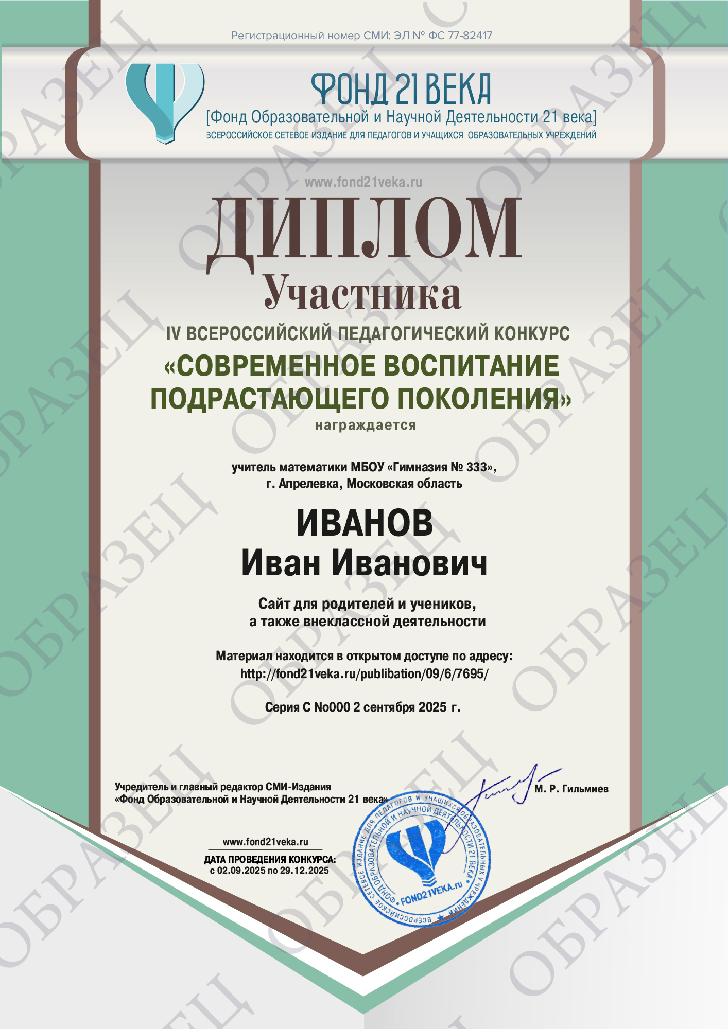 4. Если Вам необходимо документальное подтверждение участия / результата участия в конкурсе, Вы можете заказать изготовление электронного диплома. Эскизы документов, для увеличения нажмите на диплом: