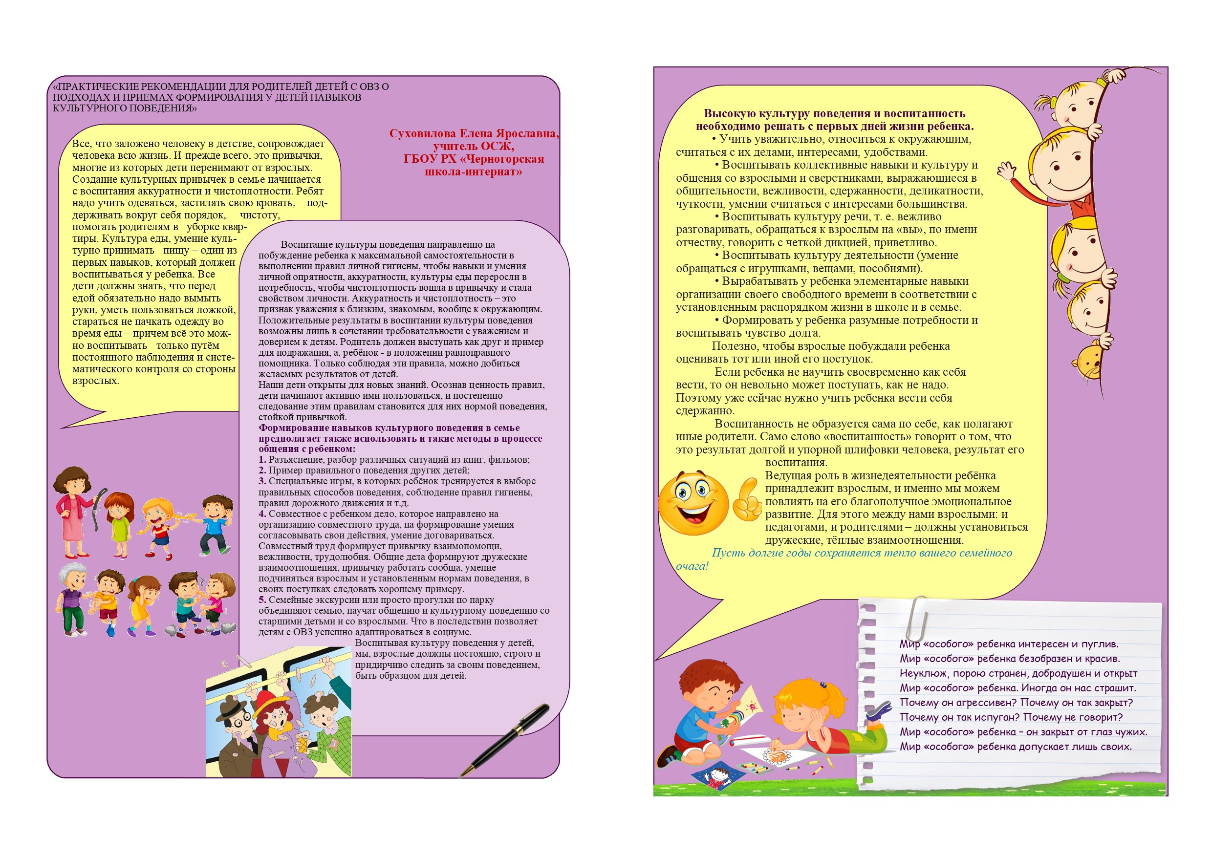 "ПРАКТИЧЕСКИЕ РЕКОМЕНДАЦИИ ДЛЯ РОДИТЕЛЕЙ ДЕТЕЙ С ОВЗ О ПОДХОДАХ И ПРИЕМАХ ФОРМИРОВАНИЯ У ДЕТЕЙ НАВЫКОВ КУЛЬТУРНОГО ПОВЕДЕНИЯ»
