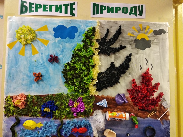коллективная работа детей средней группы в рамках проекта "Берегите лес". выполнена из бросового материала.