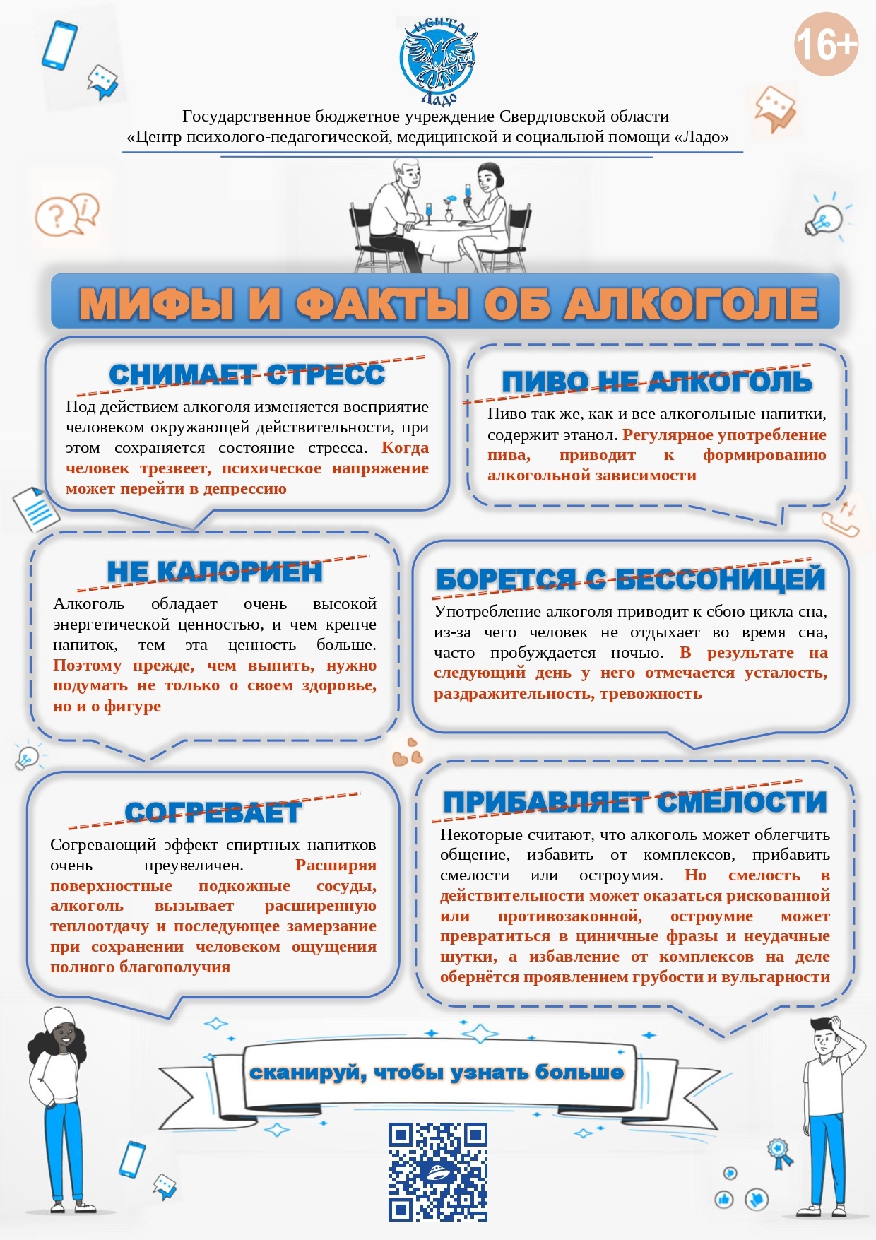 Инфографика для детей (16+) с интерактивными элементами "Мифы и факты об алкоголе". Данная разработка сопровождается видеороликом https://vkvideo.ru/video-100488176_456239241 при наведении на qr код