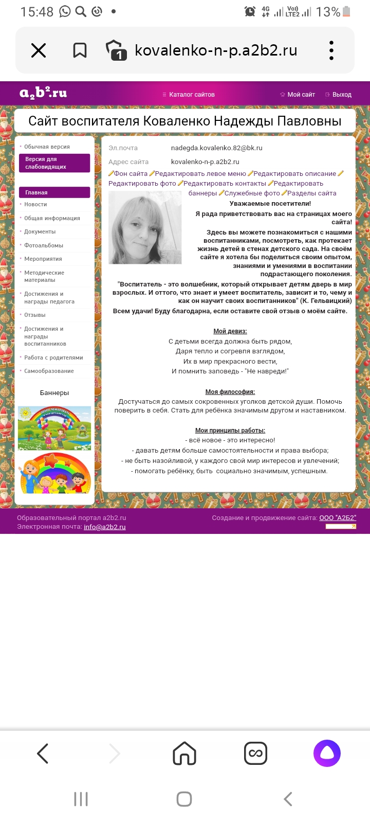 На сайте загружены документы об образовании воспитателя, достижения и награды воспитателя и воспитанников, самообразование воспитателя, методические материалы и фото из жизни воспитанников. Адрес сайта: http://kovalenko-n-p.a2b2.ru