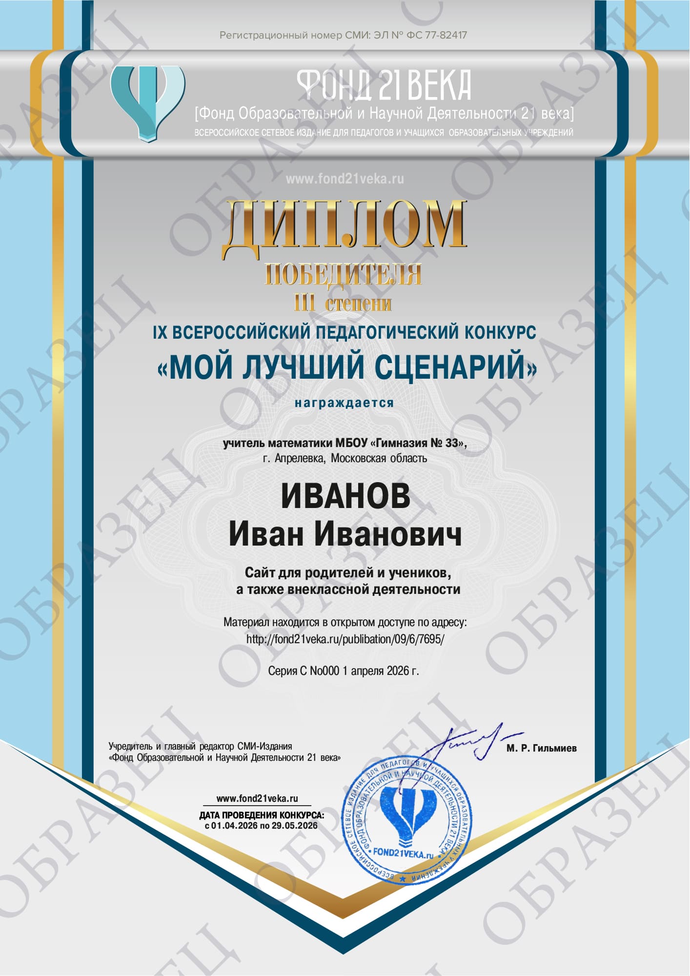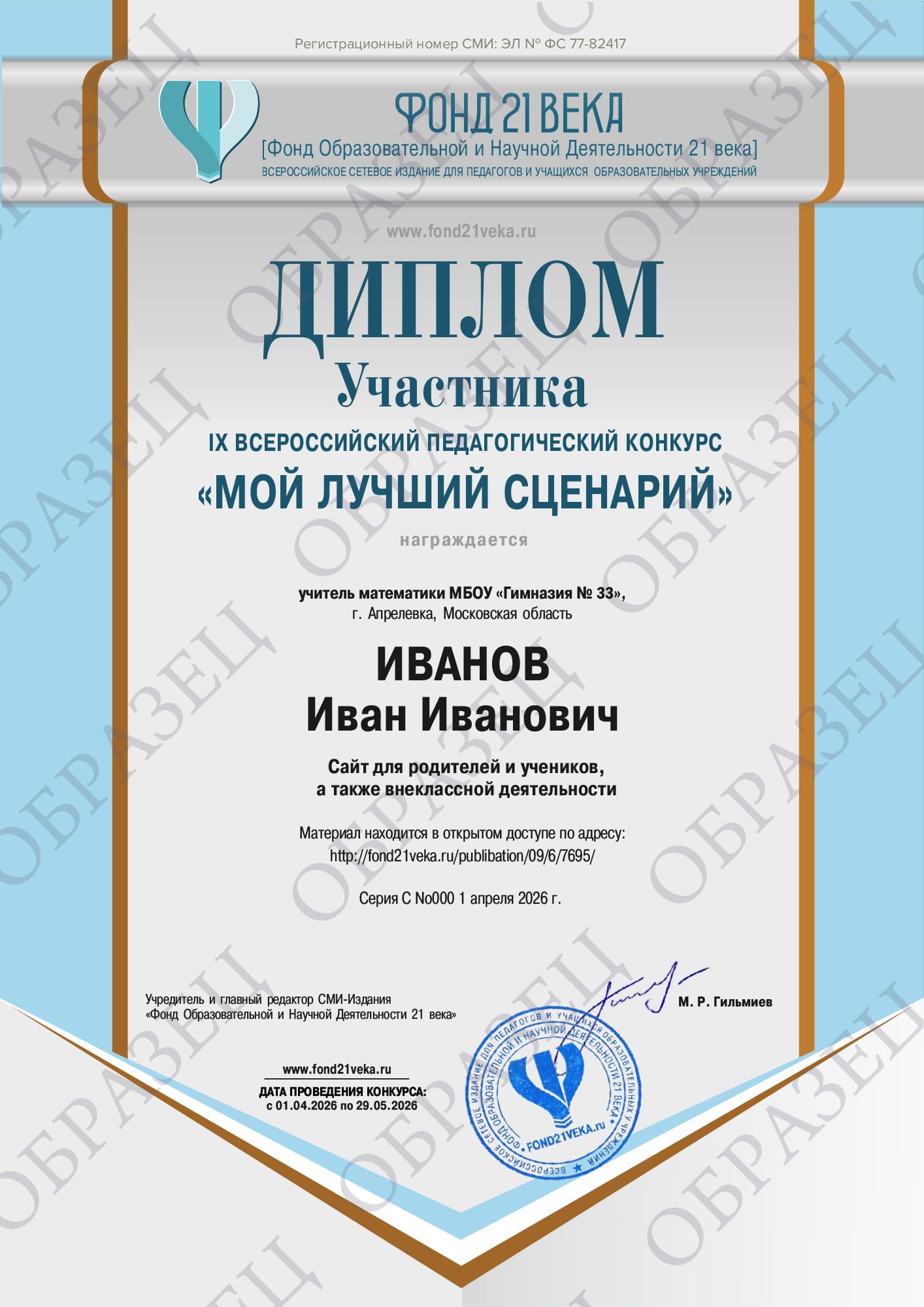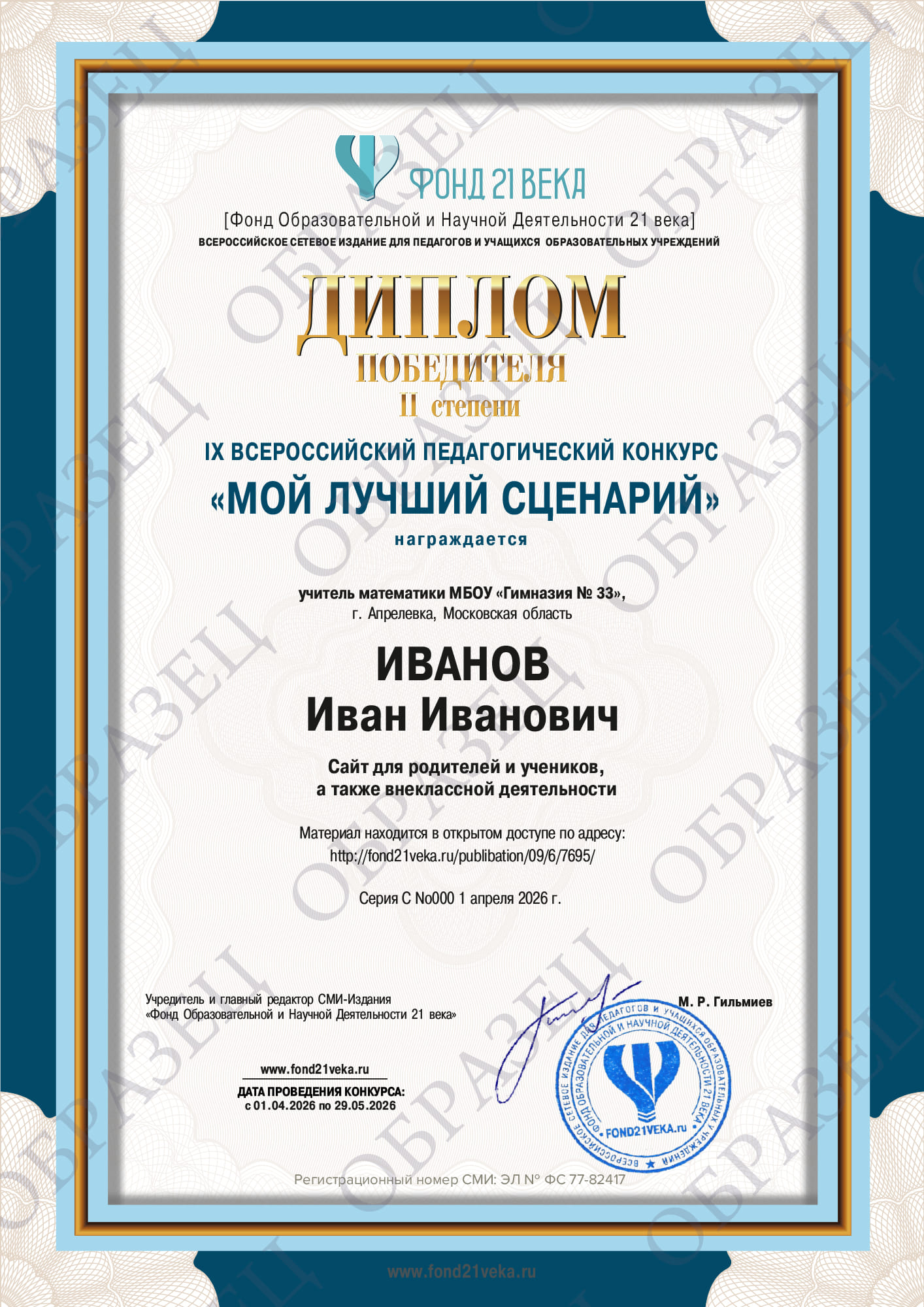 3. Ваш опыт, труд и знания будут сохранены: работы участников публикуются в электронном каталоге издания. Педагоги, проявившие высокую степень профессионализма и активность (более 3 победных работ), будут награждены благодарственными письмами за профессиональный вклад в дело сохранения педагоги-ческого опыта и мастерства в рамках проекта «Фонд Образовательной и Научной Деятельности 21 века».