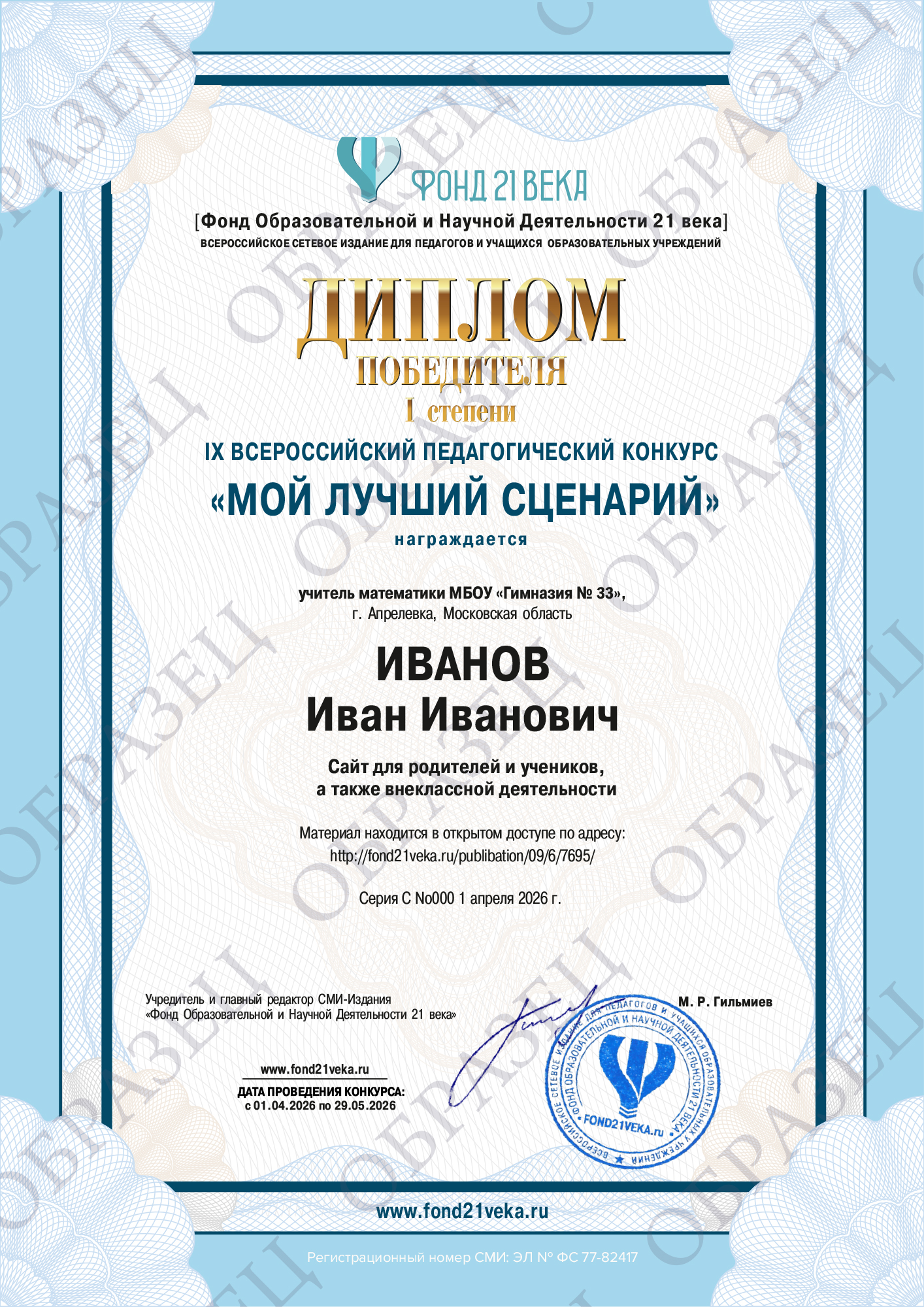 3. Ваш опыт, труд и знания будут сохранены: работы участников публикуются в электронном каталоге издания. Педагоги, проявившие высокую степень профессионализма и активность (более 3 победных работ), будут награждены благодарственными письмами за профессиональный вклад в дело сохранения педагоги-ческого опыта и мастерства в рамках проекта «Фонд Образовательной и Научной Деятельности 21 века».