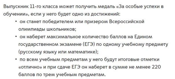 В Минпросвещении нашли решение. В этому году ведомство внесло на рассмотрение проект, по которому медаль начнет выдаваться при успешной сдаче ЕГЭ. Чиновники предлагают установить планку в 70 баллов по русскому языку и профильной математике — только так выпускник сможет подтвердить свою награду.
