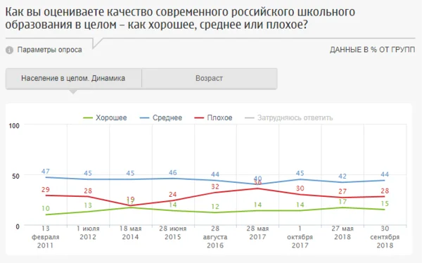 В целом, россияне оценивают школы на том же уровне, что и раньше, — только 15% относятся к качеству образования положительно. Положительная динамика есть, но небольшая. При этом лишь 5% опрошенных раскритиковали введение ЕГЭ.