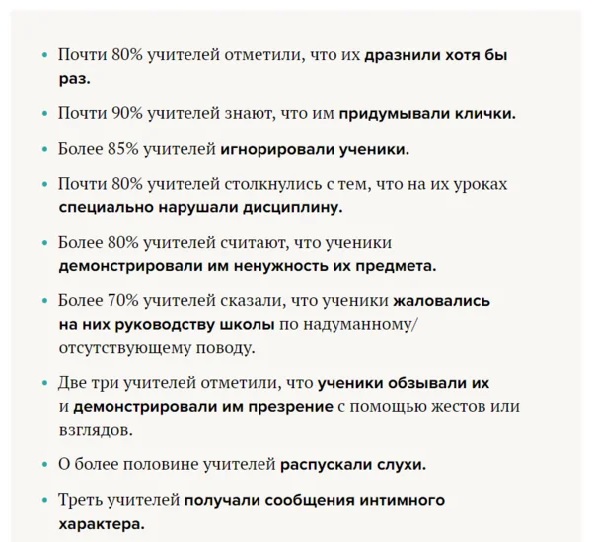 В этом году ВШЭ провела опрос среди 2800 учителей из десятка регионов России — их спросили, как часто они подвергаются травле. 70% преподавателей хотя бы один раз сталкивались с агрессией по отношению к себе, 50% опрошенных — несколько раз за карьеру, а 6% — регулярно. Половина педагогов объясняет такое поведение у детей желанием возвыситься в глазах одноклассников.