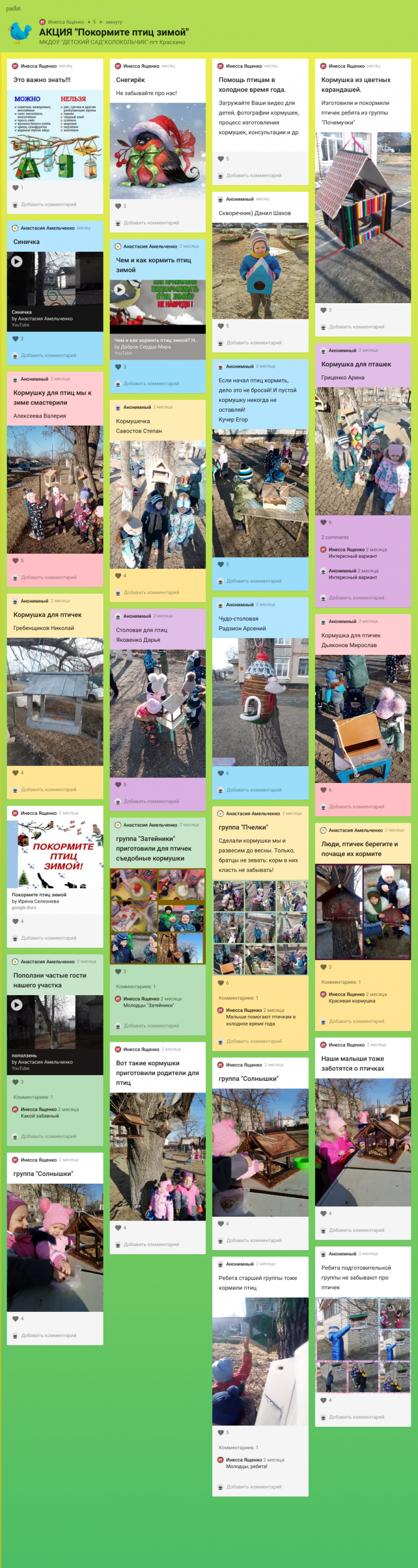 Акция «Покормите птиц». Ее целью является изготовление кормушек детьми совместно с родителям и необычное, вкусное угощение для птиц и, их размещение на территории детского сада, организация дежурств в «птичьей столовой».