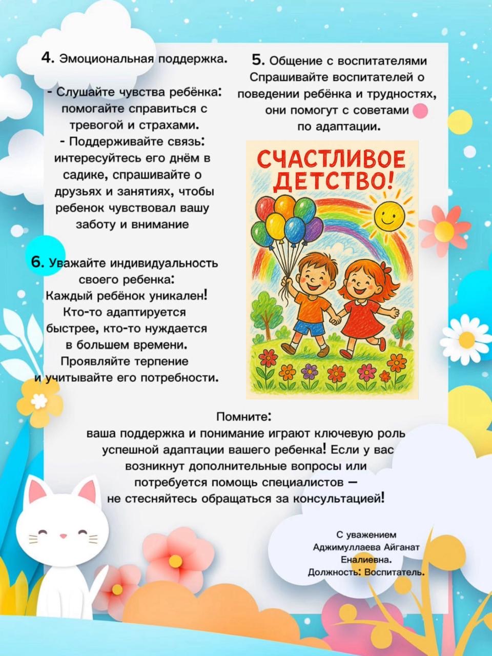 Разъяснить основные этапы адаптации ребёнка к детскому саду: знакомство, привыкание к новому режиму и коллективу, формирование доверия к воспитателям.