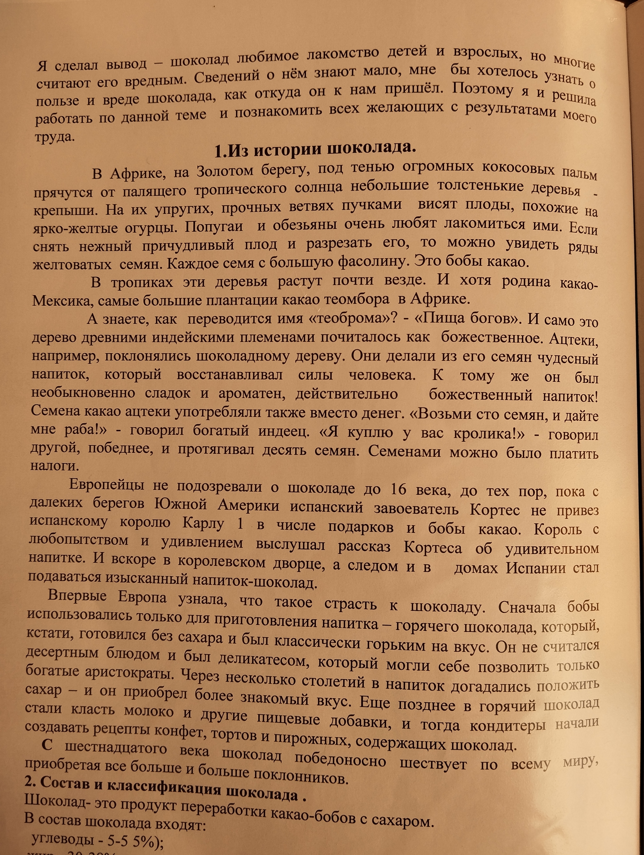 Введение: История шоколада. Состав и классификация шоколада. Польза шоколада негативное влияние на шоколада. Шоколадные рекорды Гиннеса. Опыт. Приготовление шоколада в домашних условиях. Изучение свойств шоколада.