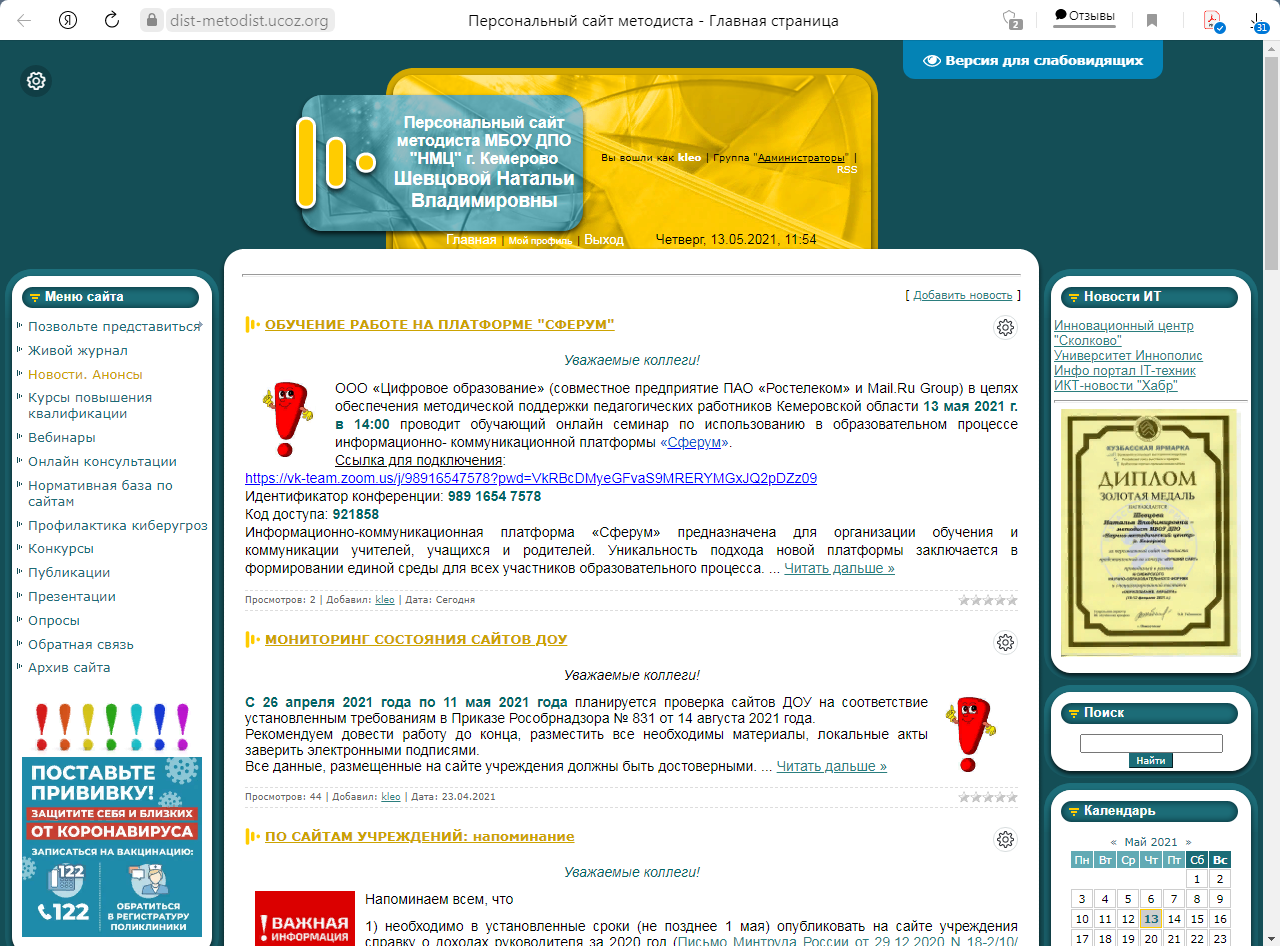 Сайт становился победителем всероссийских конкурсов; получил Золотую медаль на Межрегиональном форуме-2021.